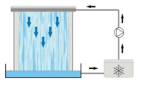 UN CLIMA ESTABLECIDO EN LA SALA"VELAS" O UN CLIMA"PARED" ESTÁ CUBIERTO POR EL FRÍO MOJADOS DE AGUA. UNA UNIDAD EXTERIOR/BOMBA DE CIRCULACIÓN PRODUCE EL AGUA FRÍA PARA EL SUPERFICIE. UNA PELÍCULA DE AGUA FRÍA FLUYE AHORA. LA PELÍCULA DE AGUA FRÍA ESTÁ EN CONTACTO DIRECTO CON EL AIRE INTERIOR. EL AIRE QUE PASA SE ENFRÍA Y EL LA HUMEDAD SE CONDENSA. LA TEMPERATURA DEL AIRE EN LA HABITACIÓN TAMBIÉN SE REDUCE LIGERAMENTE.
